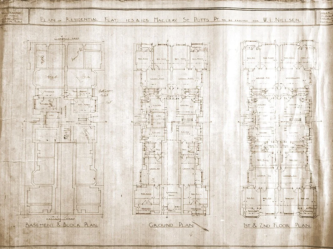Plan of Residential Flats 123 & 125 Macleay St Potts Point to be erected for W.L. Nielsen, 1928 (L-R, Basement & Block Plan, Ground Plan, 1st & 2nd Floor Plan) (Credit: Franconia Archives)